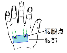 右図「腰腿点」 (片方の手の甲に二つあり、人差し指と中指の間の溝、薬指と小指の間の溝をそれぞれ手首の方に向かってたどり止まるところ)