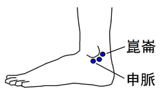 「申脈」 (外踝尖の直下、外踝下縁と踵骨の間の陥凹部)