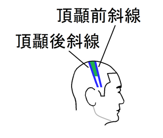 頂顳後斜線:「曲鬢」(もみあげ後縁の垂線と耳尖の水平線の交点)~「百会」(頭部正中線と左右の耳尖を結んだ線の交叉部)の線